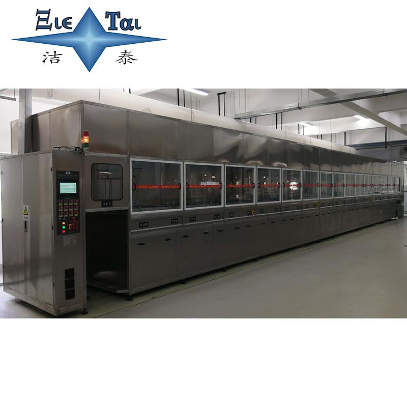 潔泰電池殼模用機械臂式全自動超聲波清洗機,主要由:機械傳動系統(tǒng)、超聲波系統(tǒng)、加熱系統(tǒng)、烘干系統(tǒng)、給排水系統(tǒng)和電氣控制系統(tǒng)等6部分組成,一般采用PLC進行控制,操作簡便,可通過修改程序方便地調(diào)整設(shè)置參數(shù)及工藝流程在線監(jiān)視系統(tǒng)的工作狀態(tài),可自動完成工件的粗洗、噴淋、噴流、熱浸、漂洗、鼓泡、烘干等工藝,大大節(jié)約人力,提高效率。